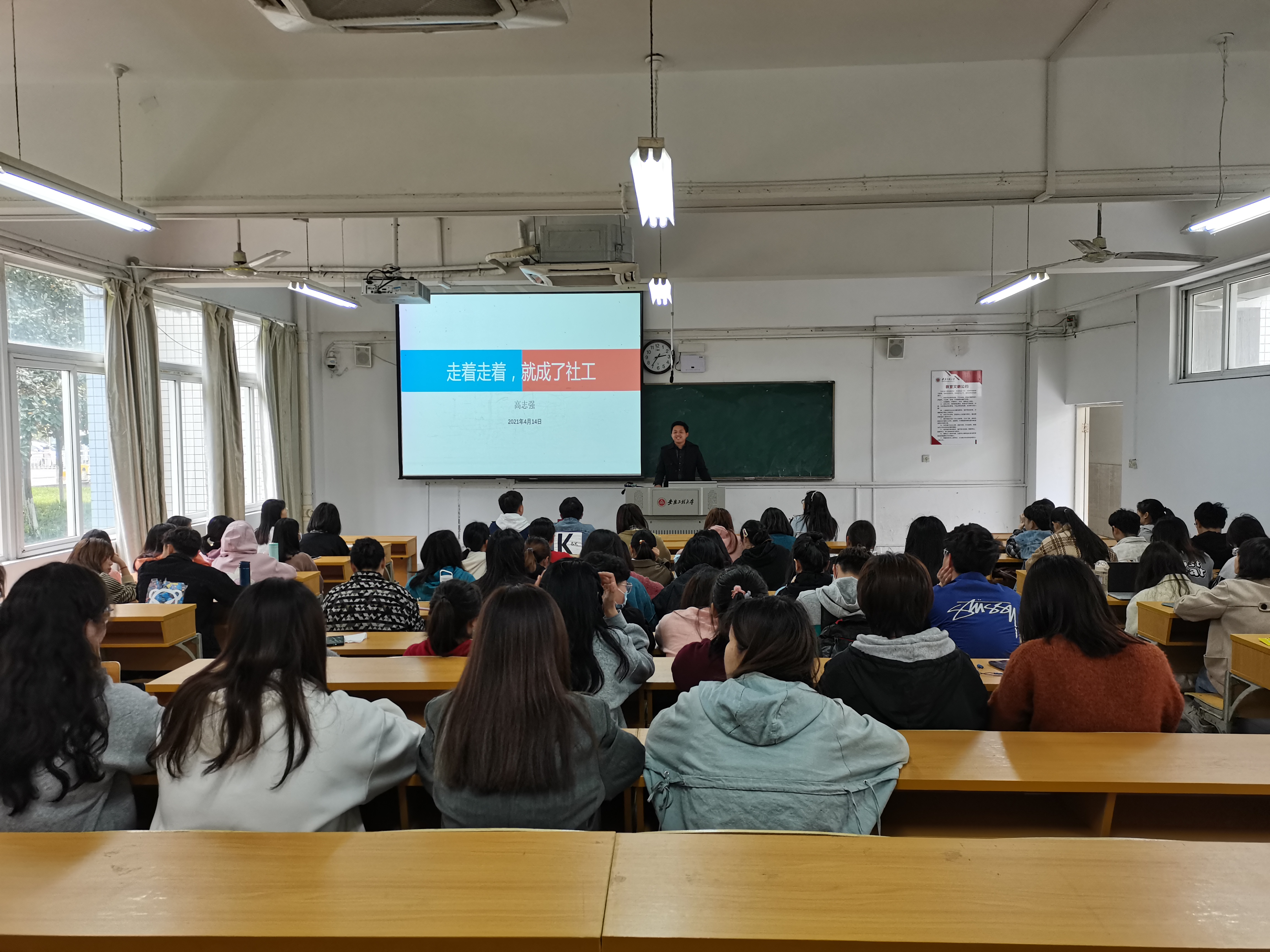 414日下午,我校4J111举办人文学院“学术月”系列活动之社工论坛,报告主题为“走着走着,就成了社工”,报告人为合肥市庐阳区实创公益发展中心理事长、社会工作师高志强。人文学院党委副书记金艾裙、院团委书记谢红翠、辅导员严煌、社会工作专业本科生、研究生等参加此次论坛,论坛由社会工作系主任周纯主持。
