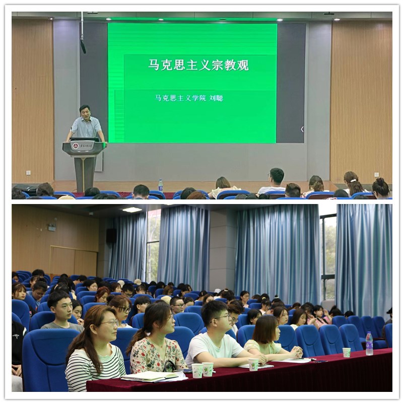 建党百年之际,为筑牢青年大学生理想信念之基,引导广大学生科学认识宗教,预防非法宗教对大学校园的渗透,帮助同学们树立正确的世界观,510日晚,人文学院在5117举办马克思主义宗教观专题讲座。邀请马克思主义学院刘聪教授主讲。院党委副书记金艾裙、院团委书记、全体辅导员、19级全体学生共150余人参与学习。讲座由院党委副书记金艾裙主持。