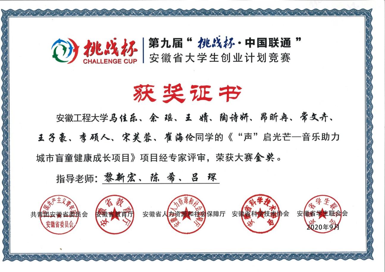 第九届“挑战杯·中国联通”安徽省大学生创业计划竞赛金奖