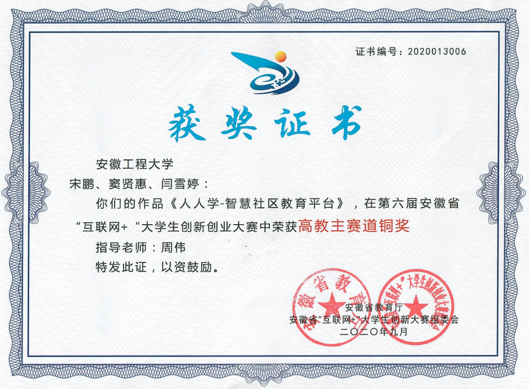 第六届安徽省“互联网+”大学生创新创业大赛铜奖