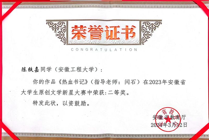 2019年安徽省大学生原创文学新星大赛中取得二等奖