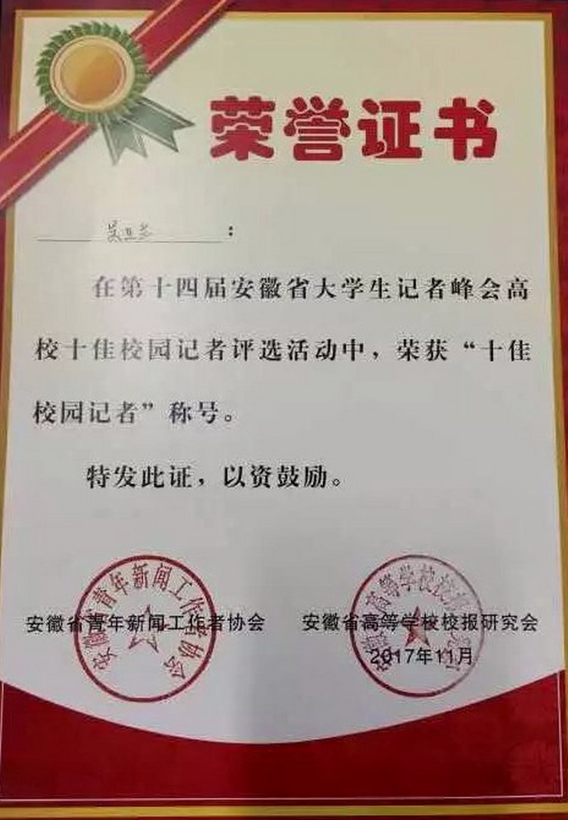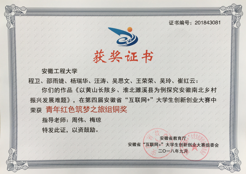 2018年获第四届安徽省“互联网”创新创业大赛青年红色筑梦之旅铜奖