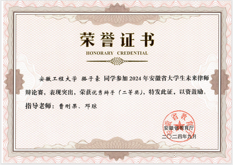 安徽省大学生未来律师辩论赛优秀辩手(三等奖)