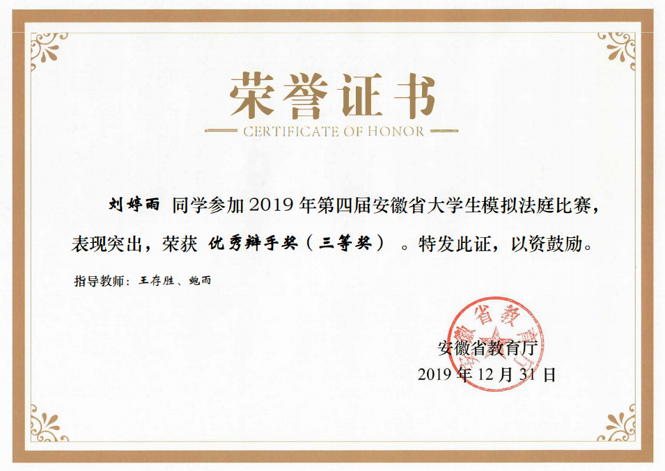 刘婷雨2019年第四届安徽省大学生模拟法庭比赛三等奖