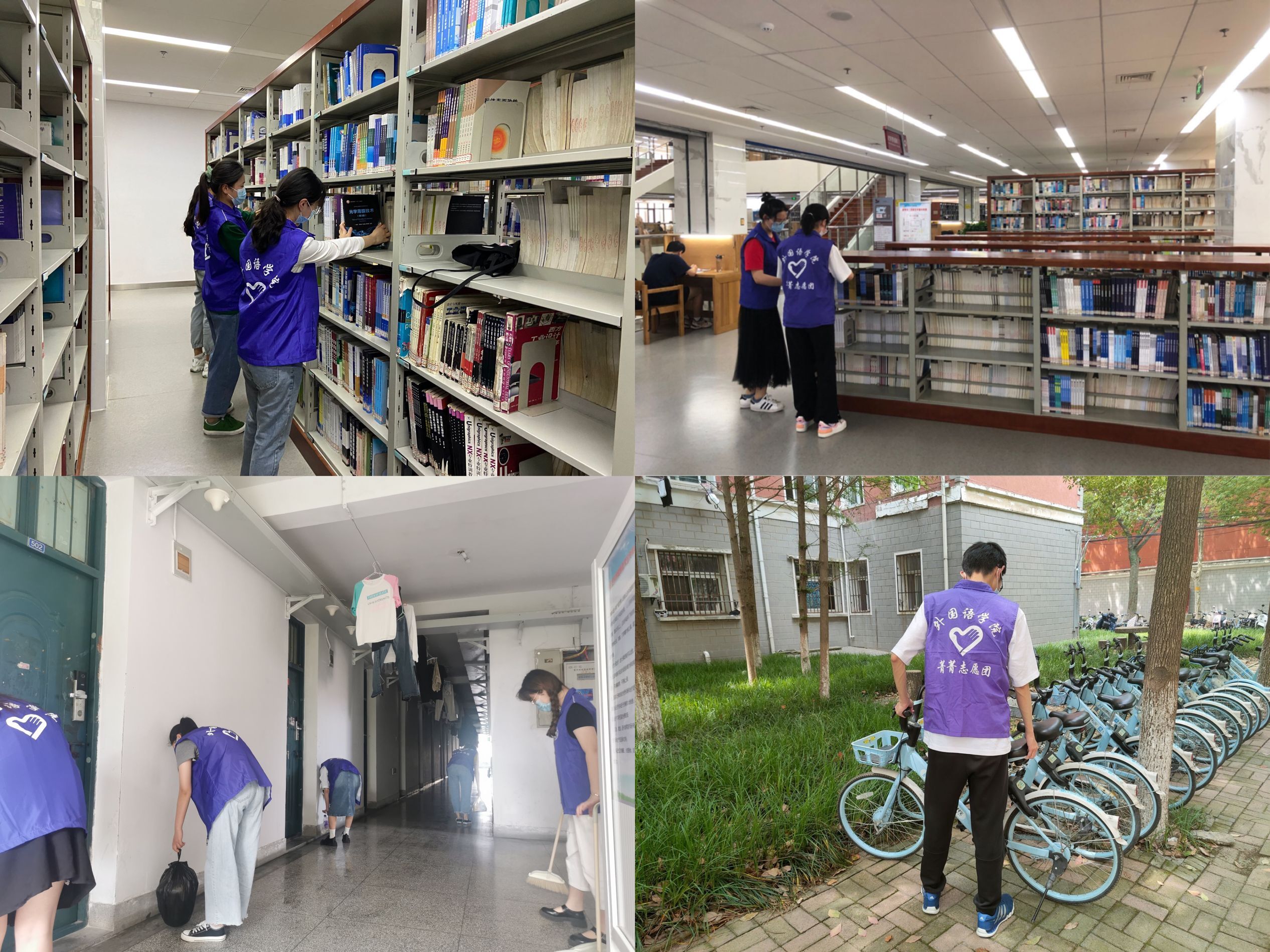 各小组分工明确,按时到达指定地点,井然有序地开展活动。在图书馆,志愿者们把读者还回的图书按类别推到不同的楼层,分类排序,依次上架;在6教教室,志愿者们擦去黑板上的字迹、抹去讲台上的灰尘并清理掉课桌桌肚中的垃圾;在女生1栋和7栋宿舍楼,志愿者们将楼道里的垃圾集中起来,运送到楼外的垃圾箱;在三、四食堂,志愿者们一手拿着抹布,一手提着水桶,及时清理掉油腻的餐桌垃圾;在校园内,志愿者们按顺序合理摆放共享单车和电动车,方便路人行走。天气炎热,汗水浸透了志愿者们的衣服,但他们洋溢着青春气息的脸上却有着一丝坚毅和倔强,保质保量地完成各项任务。