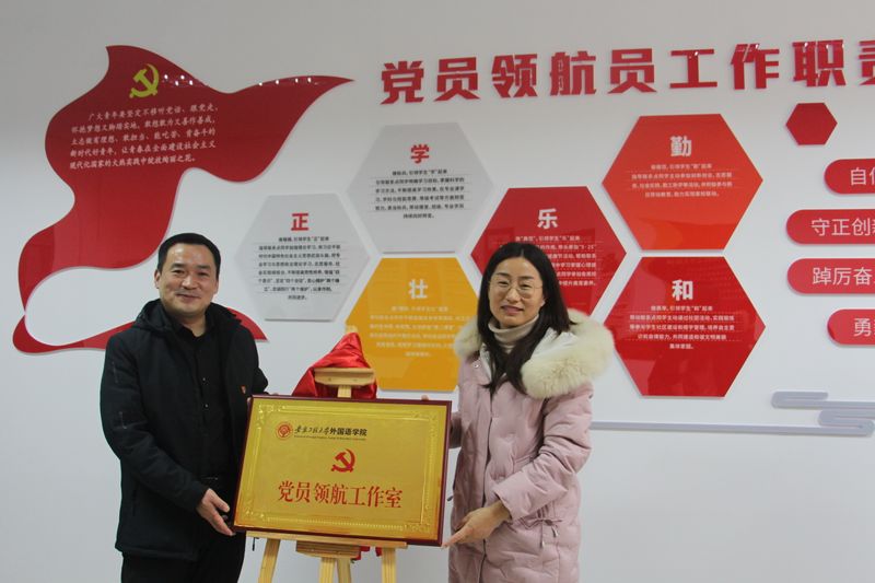 12月9日,外国语学院党委书记董金权和校党委组织部副部长朱文明为党员领航工作室揭牌,校学生处副处长兼心理健康教育中心副主任杜松涛为党员领航员颁发聘书、佩戴领航员工作牌,全体学生党支部书记、辅导员、学生党员领航员参与成立仪式,活动由外国语学院党委副书记李校林主持。