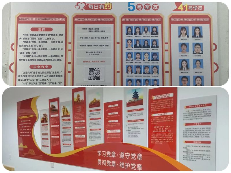 “每日有约”践行“一线工作法”,建立学院党员领导和党员教师坐班制,通过每周一至周五与学生相约工作室,把学院领导力量、思政力量、管理力量、服务力量下沉学生一线,实现师生双向奔赴;“5号室友”为每个新生学生寝室配备一名党员领航员,指导各寝室建成安全卫生、学风优良、和谐文明“全星宿舍”;“41号学员”在低年级各班级安排一名党员学长导员,协助建设先进班级和标兵班集体。