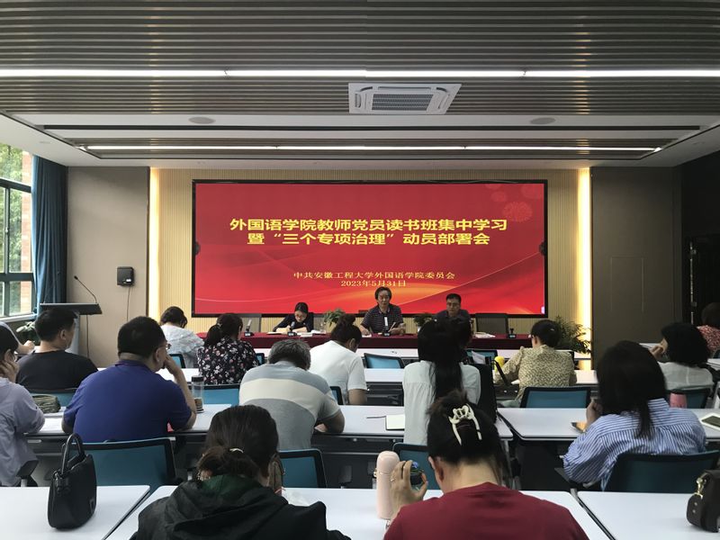 为深入学习贯彻习近平新时代中国特色社会主义思想,持续推进主题教育走深走实,落实学校“三个专项治理”工作要求,将主题教育和检视整改融合贯通起来,5月31日下午,外国语学院在学院209会议室开展教师党员读书班师德师风专题学习暨“三个专项治理”动员部署会。学院读书班学员及其他教职工参加会议。
